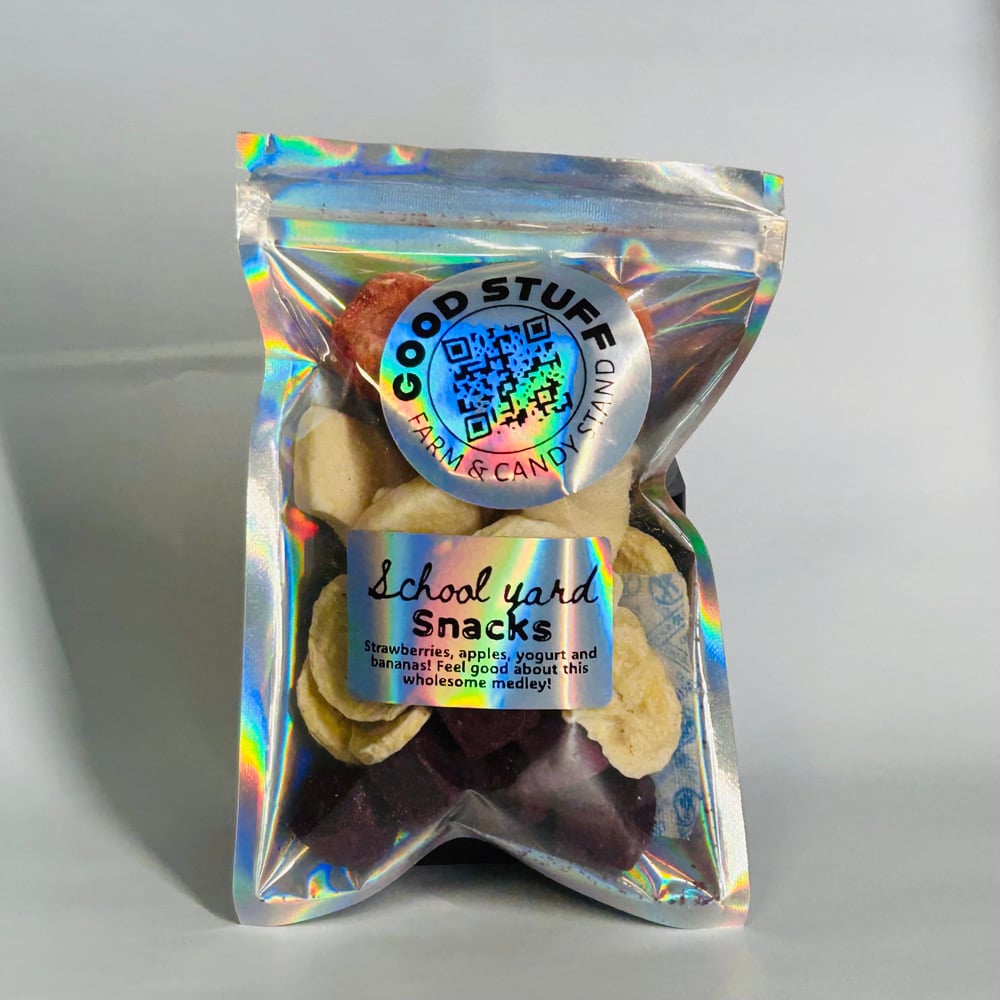 The first option is “schoolyard snacks”, it features freeze dried strawberries, bananas and apples, with some blueberry yogurt cubes as well!
